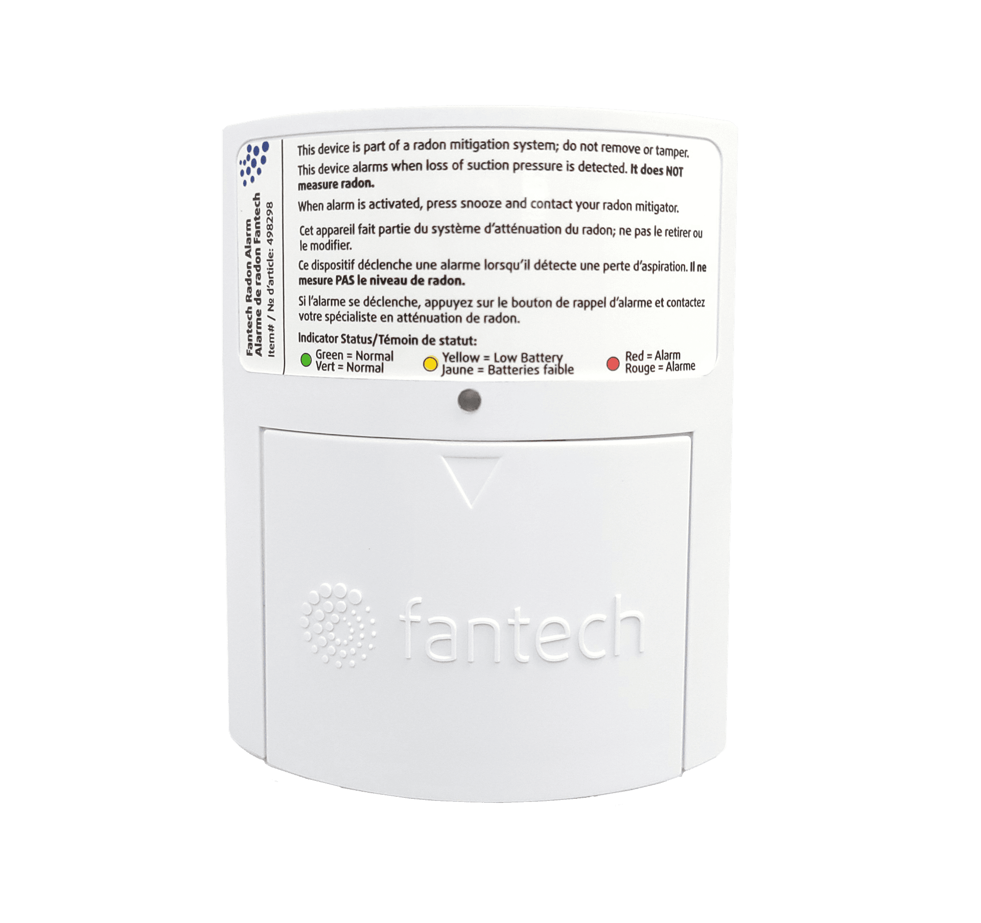 Radon Alarm meets AARST Standard CCAH-2020, Section 1001. Monitors mitigation fan performance and notifies occupants of fan failure.