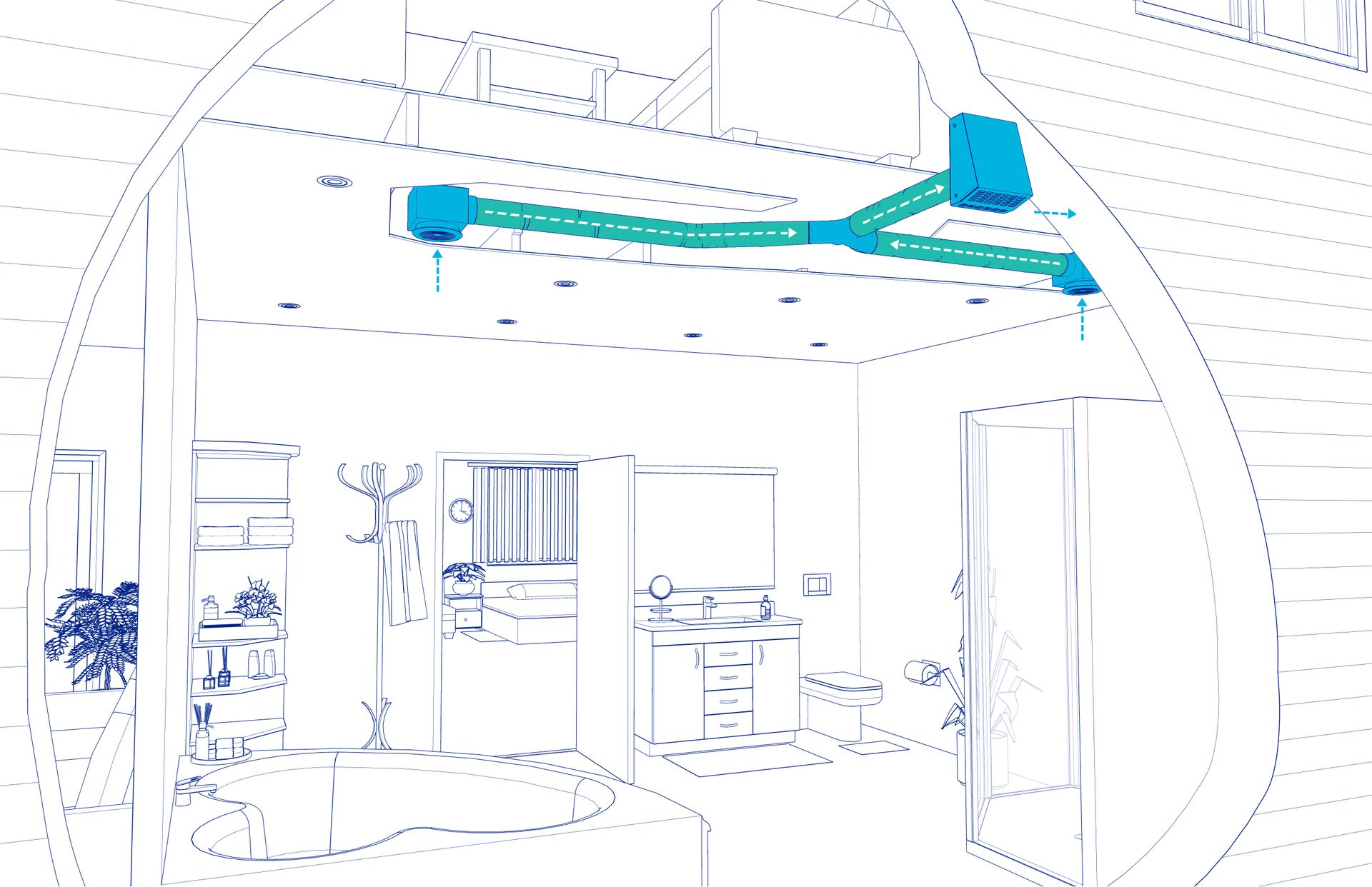 The fan’s natural sound is kept outdoors, at a distance from the ceiling grille for quiet operation, and removes moist air from the space efficiently and quickly.